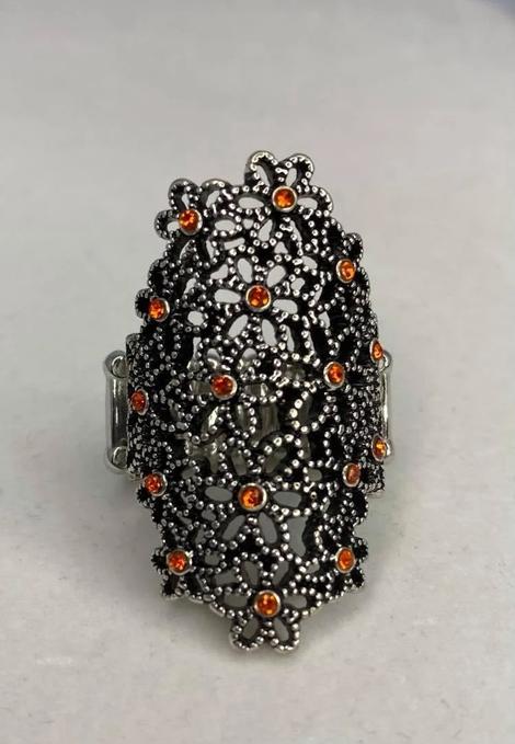Dainty orange rhinestones are sprinkled across a shimmery frame swirling with silver filigree, creating a whimsical floral frame atop the finger. Features a stretchy band for a flexible fit.